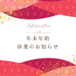 2025年12月18日 / 最終更新日時 : 2025年12月18日 vishnu お知らせ 年末年始 休業のお知らせ 年末年始休業のお知らせ 【休業期間】2025年12月31日(水)~2026年1月4日(日) 2026年1月5日(月)より通常営業いたします。 本年も当サロンをご利用いただき、誠にありがとうございました。 来年もよろしくお […]